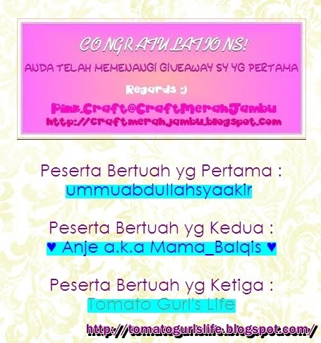 Yang ketiga cik tom menang tempat ke-3 dari Sheila tuan punya craft merah jambu. Thanks shelila!!Jomlah singgah blog Sheila ni tengok hasil craft Sheila yang terbaru.cantik2!! dan kepada siapa2 yang suka join contest tue rajin2 lah singgah blog ni sebab Sheila akan mengadakan giveaways yang kedua. Cik tom akan tunggu hadiah cantik dari Sheila tue.lalala..