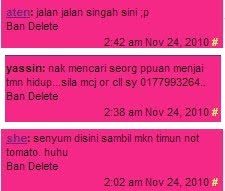 Semalam cik tom online sehingga lewat pagi sebabnya nak pulun balas jejak kawan. Tapi tak habis jugak. InsyaAllah yang tak sempat dibalas lagi tue, akan bersambung malam ni pulak. Masa duk balas2 kunjungan tue, cik tom terkejut ada yang letak iklan cari jodoh kat shoutmix cik tom. Entah siapa la mamat nama yassin ni. Siap bagi no handphone lagi nak mencari seorang perempuan menjadi teman hidup. Ada sesiapa berminat tak??Kalau berminat mesej or call yassin di no 0177993264.