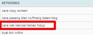 Cik tom mula2 rasa pelik jugak. Pastu teringat pulak yang sebelum ni memang cik tom pernah buat entry ” Nak Cari Teman Hidup‘. So, cik tom terus buka website nuffnang tengok keyword. Memang sah si yassin ni google sehingga terjumpa blog cik tom.