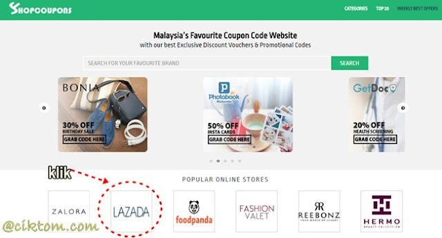 Langkah 1: Sila ke website Shopcoupons untuk dapatkan voucher diskaun atau code promosi. Kemudian klik pada online stores mana yang korang berminat. Contoh macam cik tom nak beli di Lazada. So, klik pada logo Lazada.