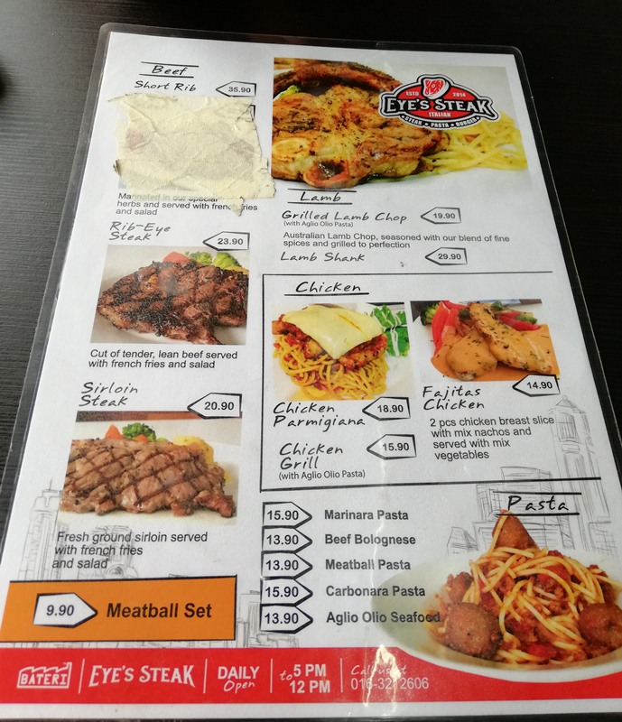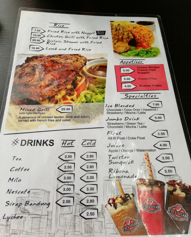 Restoran Eye’s Steak ni terletak hujung sekali di area TRAFO. Di buka setiap hari pada pukul 5 pm-12am.