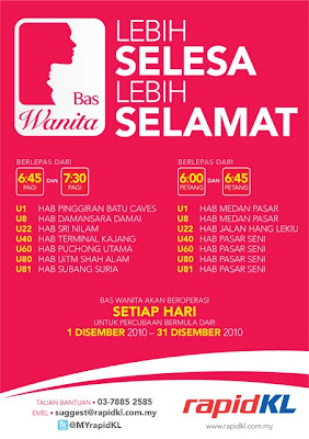Bagilah sokongan dan kerjasama semasa naik bas ye. Sokonglah bas wanita ni sebabnya sekarang tempoh percubaan selama sebulan dari 1/12-31/12/2010. Semoga perkhidmatan rapid bas wanita ni diteruskan. Banyak kebaikannya seperti gangguan seksual dan ancaman keselamatan semasa dalam keadaan bersesak-sesak dapat dielakkan.