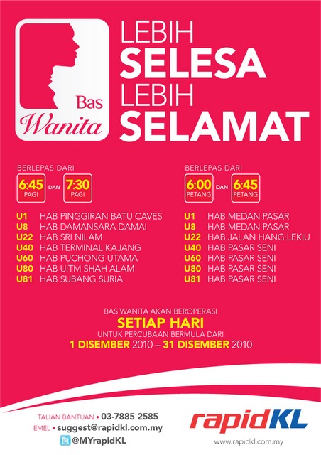 Bagilah sokongan dan kerjasama semasa naik bas ye. Sokonglah bas wanita ni sebabnya sekarang tempoh percubaan selama sebulan dari 1/12-31/12/2010. Semoga perkhidmatan rapid bas wanita ni diteruskan. Banyak kebaikannya seperti gangguan seksual dan ancaman keselamatan semasa dalam keadaan bersesak-sesak dapat dielakkan.