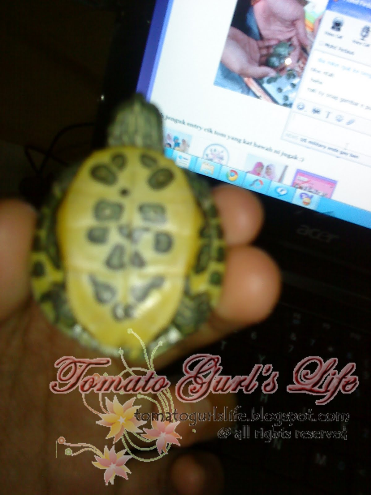 aah kura2 ni memang aktif..xleh duk diam..hehe…sekarang kura2 cik tom dah makin besar,…dah besar dari tapak tangan..yang besar tue betina..yang kecil tue jantan…
