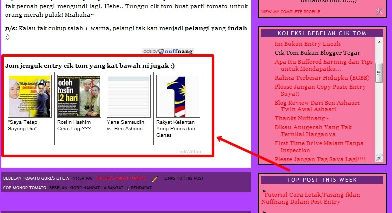Kalau sesiapa dah pernah buat tapi lupa. Cari coding linkwithin ni yang terletak dalam gadget bawah post entry korang.