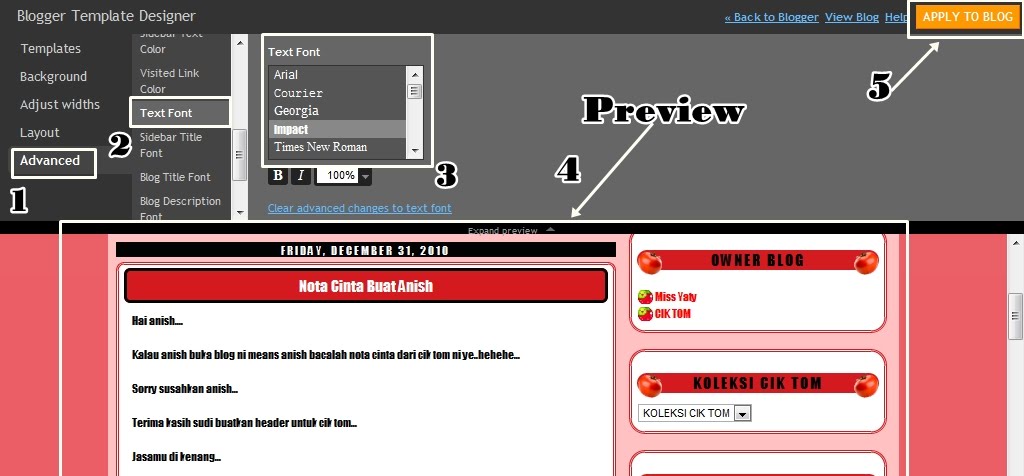 Tutorial kali ini request dari cik kamoo untuk buat tutorial macam mana nak tukar font lawa dalam entri. Sorry lama tersimpan request dari cik kamoo. Tapi kerana dah berjanji tetap cik tom cuba tunaikan walaupun lambat. Sorry ye.