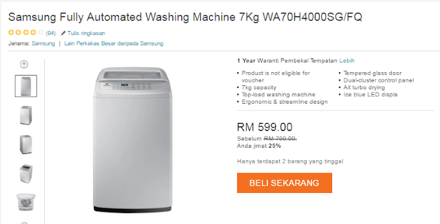 Dah ada 94 reviews pembeli sebelumnya yang rating 4/5 untuk servis dan penggunaan mesin basuh Samsung. Harga RM599 dengan less 25% bagi mesin basuh kapasiti 7kg.