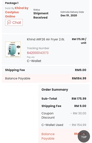 Di bawah ini bukti screenshot yang ciktom dah shopping Air Fryer Khind guna kod promosi KBBM30 dan dapat diskaun sebanyak RM30! Dari harga RM175.99 diskaun RM30 jadi hanya RM145.99 (exc postage) je tau.